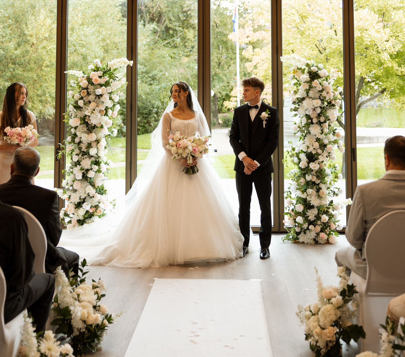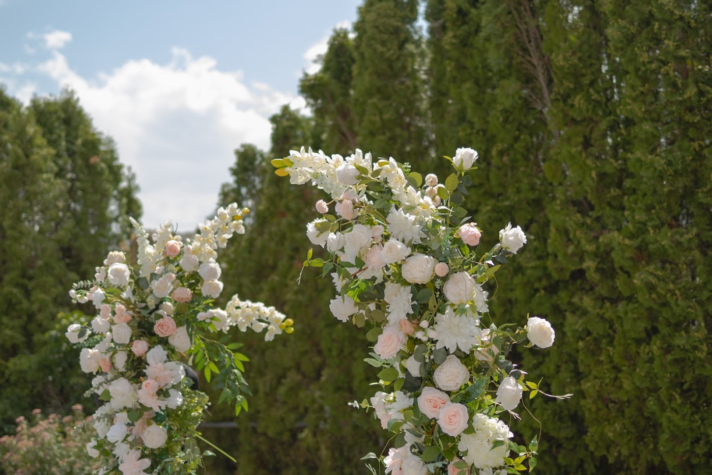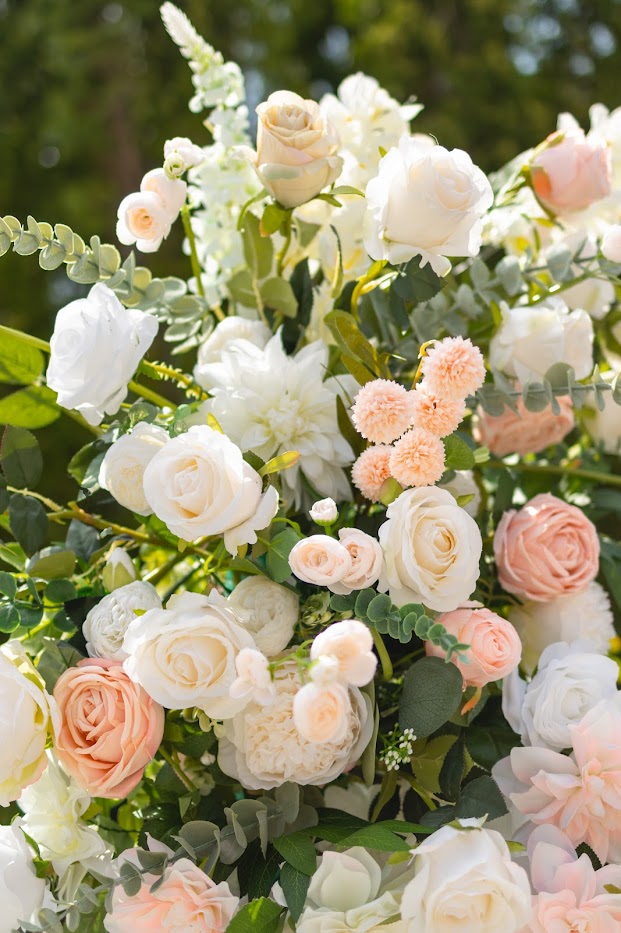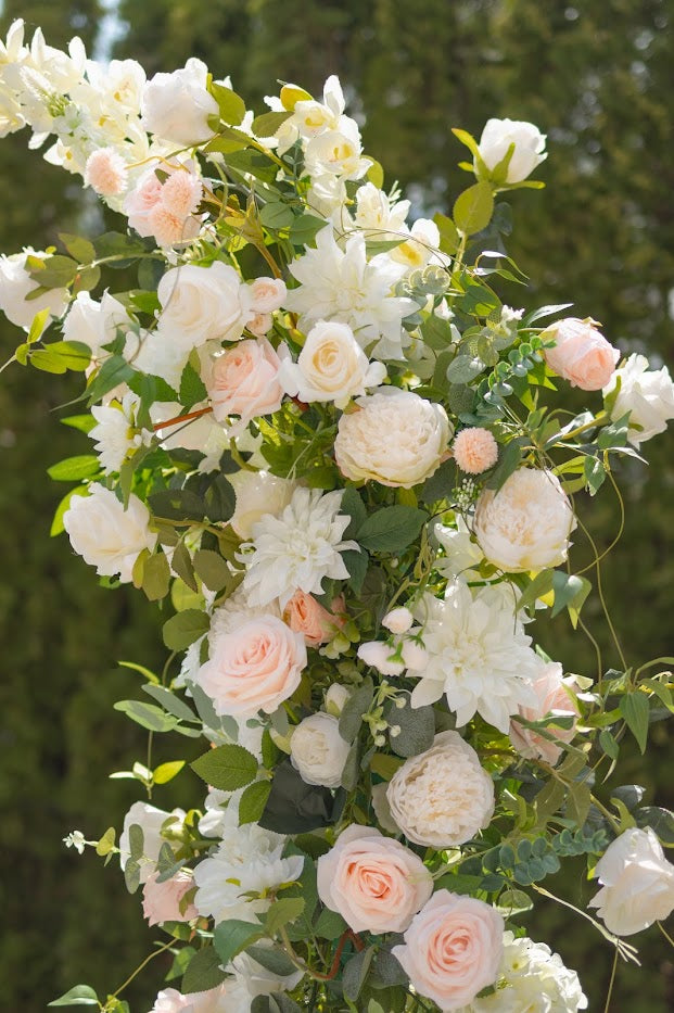 Each piece is hand-arranged with an ethereal palette of blush garden roses, ballet pink dahlias, ivory hydrangeas, white ranunculus, mauve-toned roses, soft blush peonies, and delicate white delphinium. Touches of eucalyptus and clematis bring an organic, fine art feel to the entire installation. The color scheme is a refined blend of blush, white, ivory, and mauve — perfect for modern romantic or vineyard-inspired ceremonies.